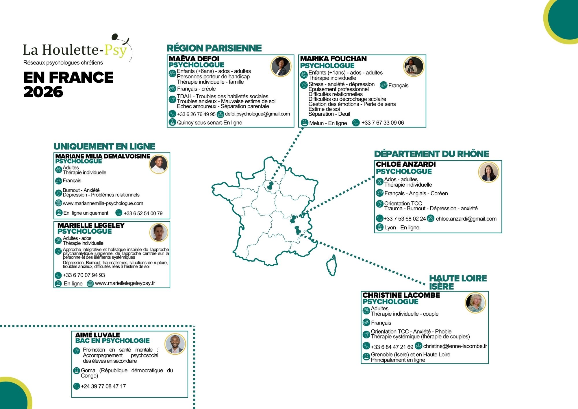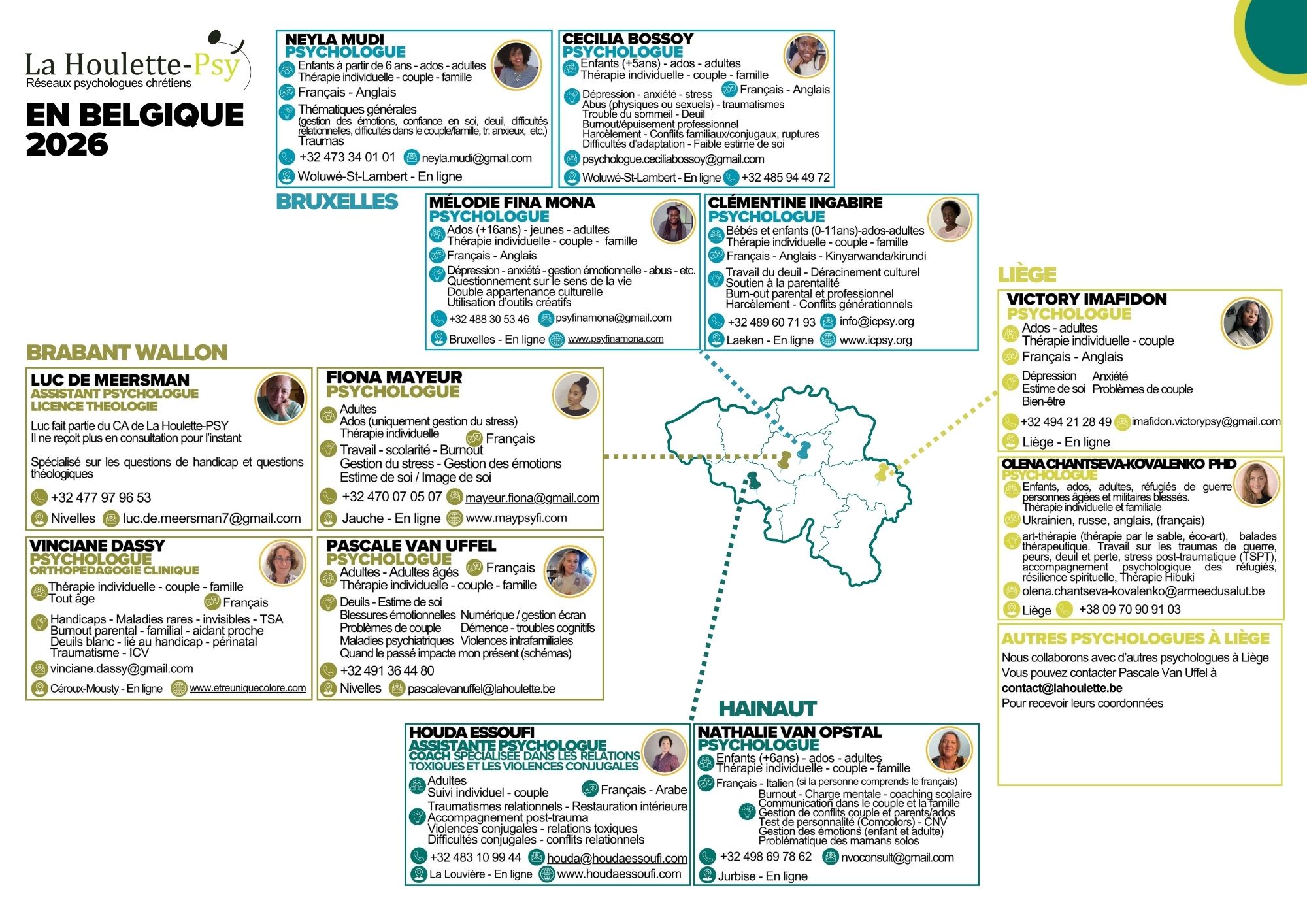 Vous trouverez les coordonnées des différents psychologues de La Houlette pour la Belgique et la France. Certains psychologues peuvent également proposer des accompagnements en ligne. Cliquez sur l’image de votre choix.